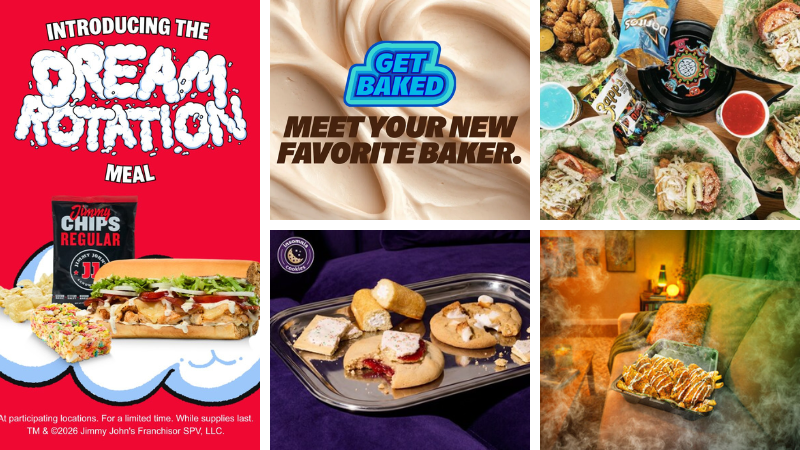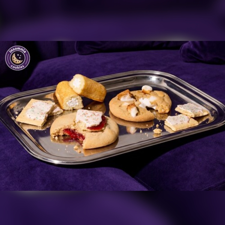 Late-night treats chain Insomnia Cookies is debuting its first-ever collab with packaged snacks maker Hostess for an aptly timed 4/20 menu. Offerings include the Cloud 9 Cravings Classic (a sugar cookie filled with cream cheese chunks, vanilla cake pieces, marshmallows and butter crumble, topped with a Hostess Twinkies snack cake) and the Strawberry Toastie Filled Classic (a sugar cookie with strawberry filling, topped with a toaster pastry). Insomnia also promised that rewards members can “anticipate surprise and delight moments” on April 20.